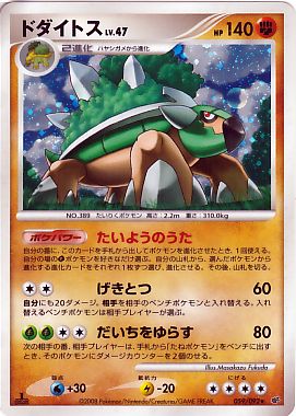 ドダイトスは「じめんタイプ」を持っていることで、 「いわタイプ」の技に対して耐性があり、ダメージを0625倍に軽減 できます。 その上、 ドダイトスの草技は「いわタイプ」のポケモンに対して16倍のダメージを与える ことができます。ドダイトス(破空の激闘)コレクションナンバー 059/093HP140 闘タイプ 2進化ポケパワーたいようのうた 自分の番に、このカードを手札から出してポケモンを進化させたとき、1回使える。自分のサトシのドダイトスと被って分かりづらいという製作側の配慮だろう ポケットモンスターSPECIAL でのドタイドス ダイヤモンド の 手持ち として登場。